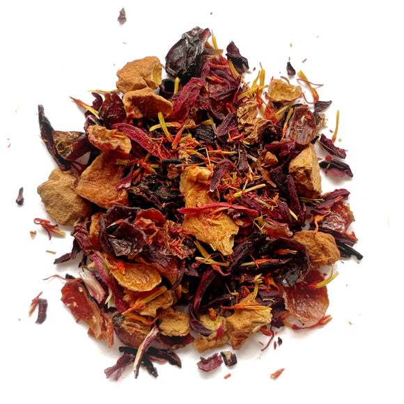 A balanced, hearty herbal blend of apple pieces, rose hip, hibiscus, safflower petals and natural flavors. Orange fruitiness in every cup of goodness. Price per 2 oz.