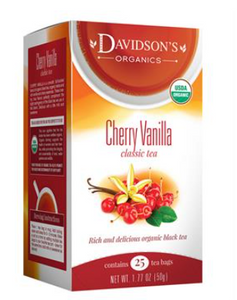 Cherry Vanilla combines organic herbs with creamy vanilla to create a full-bodied black tea brew with a touch of cherry sweetness on top. Organic. 25 bags.