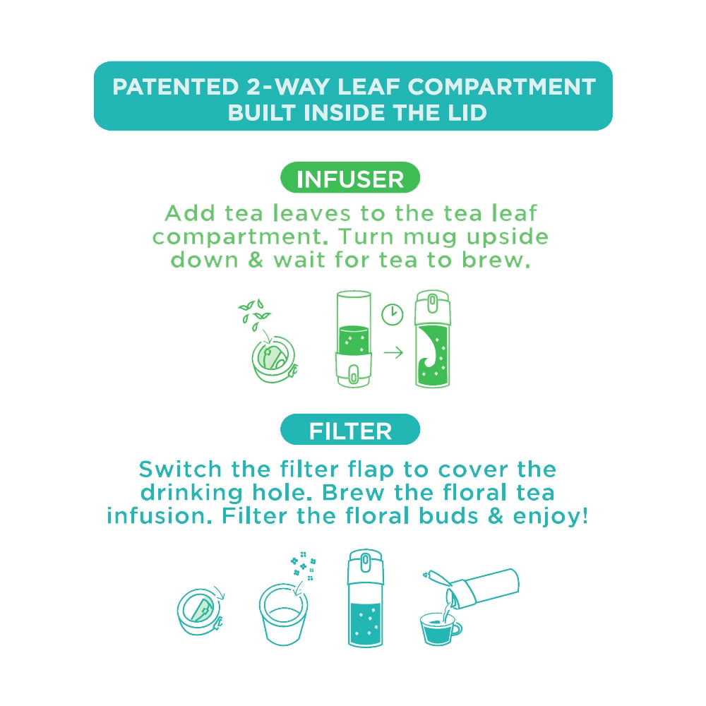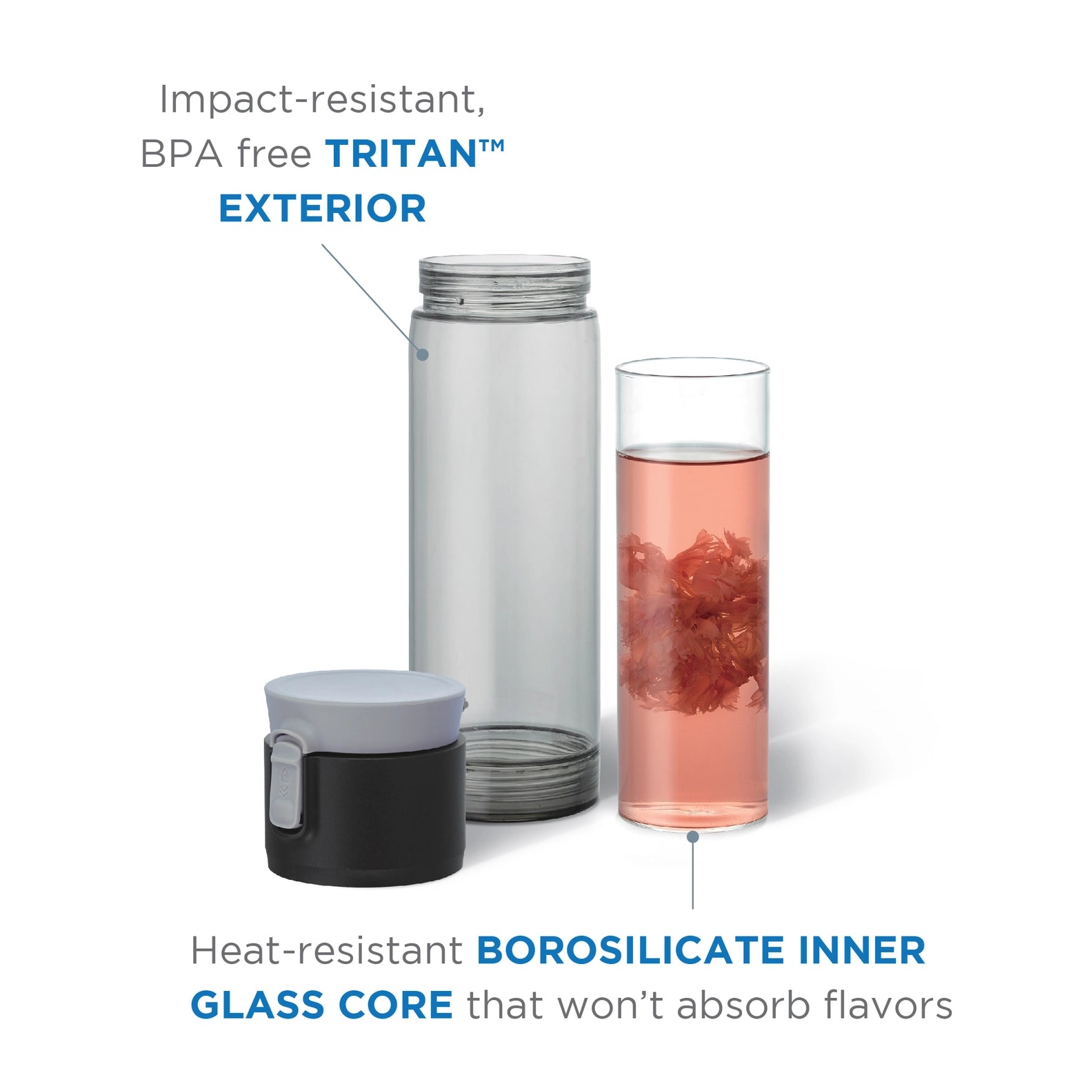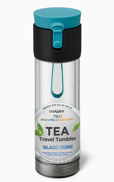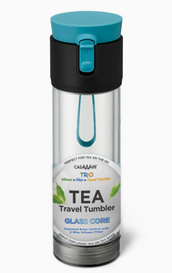 Multifunctional 12oz Tea Travel/Brewing Tumbler which can be used for loose leaf tea, tea bags and as an infuser. The Trio Clear has a double-wall construction. The exterior wall is Tritan, which is impact resistant and BPA free. The interior wall is borosilicate glass. Only the glass interior comes into contact with your beverage. You can see the color of your tea or other beverage through the clear wall. One hour hot or cold. Includes our patented two-way leaf compartment built into the lid. The tumbler is leak-proof and has a lock button that keeps the lid from popping open. Includes a strap for easy carrying. We recommend hand cleaning for this item